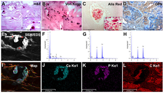Examination of BC tissue with calcifications (group I). (A)—hematoxylin-eosin staining; (B)—von Koss staining of BC tissue; (C)—alizarin red staining of BC tissue. (D)—IHC expression of OPN. The figures in the inserts correspond to the enlarged area of this sample. (E)—SEM of BC. (F–H)—EDX spectra correspond to the measurement points in Figure E. (I)—EDX mapping of BC tissue: turquoise corresponds to calcium ions (J); purple—phosphorus (K); red—carbon (L). Magnification is indicated in the lower left corner of the image as a marker.
