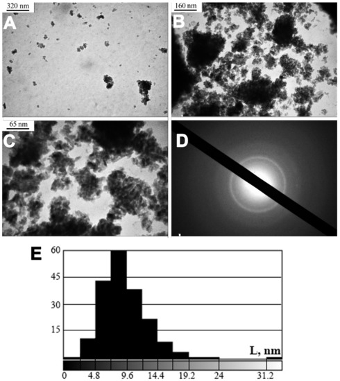 TEM with ED of calcified BC samples. (A–C)—crystals; (D)—electron microdiffraction; (E)—histogram of the crystal particle size distribution. X-axis—nanocrystal size; Y-axis—numbers of samples.
