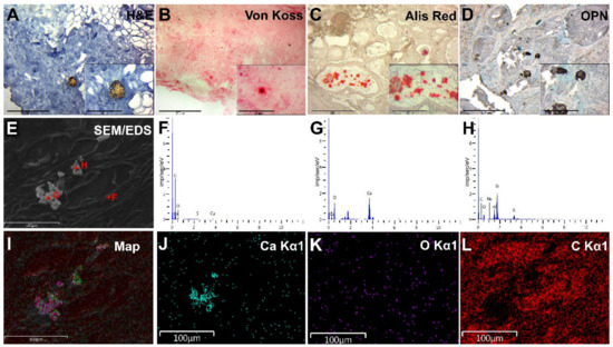 Examination of BC tissue with calcifications of non-hydroxyapatite origin (group II). (A)—hematoxylin-eosin staining; (B)—von Koss staining of BC tissue; (C)—alizarin red staining of BC tissue. (D)—IHC expression of OPN. The figures in the inserts correspond to the enlarged area of this sample. (E)—SEM of BC. (F–H)—EDX spectra correspond to the measurement points in Figure E. (I)—EDX mapping of BC tissue: turquoise corresponds to calcium ions (J); purple—phosphorus (K); red—carbon (L). Magnification is indicated in the lower left corner of the image as a marker.