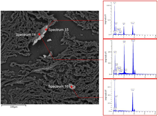 SEM and EDX of BC with microcalcifications. The spectra correspond to the measurement points in the figure. Spectra 14 and 15—hydroxyapatite; spectrum 16—calcium oxalate.