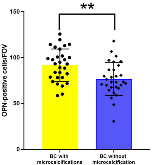 The average OPN expression in BC tissue with biomineralization (91.745 ± 3.22) is higher than in tumor tissue without calcification (76.62 ± 3.26) (p ˂ 0.01). The presence of pathological biomineralization leads to a high level of OPN protein expression in the tissue of BC (Figure 7).