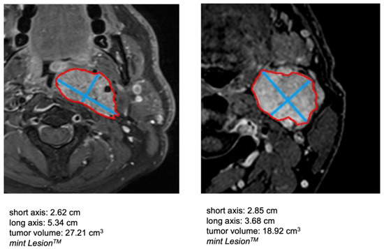 Preoperative contrast-enhanced CT or contrast-enhanced MRI of the neck region, depending on availability, were used as preoperative imaging. In the case of bilateral tumors, each side was analyzed individually. A three-dimensional tumor segmentation for tumor volume calculation was performed using three-dimensional image processing software (mint LesionTM software platform, v3.4.5; Mint Medical) by manual delineation of the tumor margins (Figure 1).