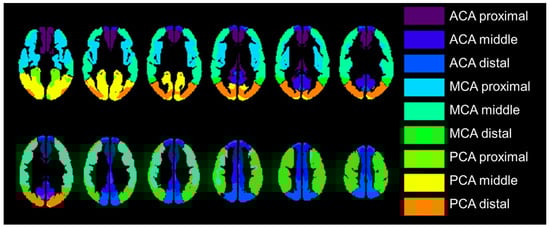 The transit time-based ROI value extraction was used in the comparison between PET and ASL parametric images, which were categorized into 18 regions: the left and right proximal, intermediate, and distal regions of each of the major anterior cerebral artery (ACA), middle cerebral artery (MCA), and the posterior cerebral artery (PCA) territories, which is previously reported and available in MNI standard space [26]. Figure 2 shows transit time-based ROIs. Relative CBF value in each ROI was calculated relative to the whole gray mask CBF value in each PET and ASL-CBF. We selected the MCA ROIs when we compared ROIs with affected and nonaffected cerebral flow based on the PET-CVR less than mean value of 30%.
