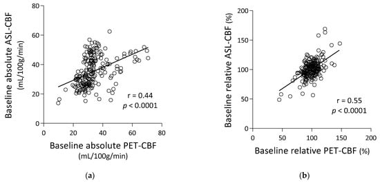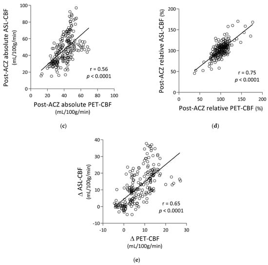 Before ACZ loading (baseline), absolute and relative ASL-CBF were significantly correlated with absolute and relative PET-CBF, respectively (Pearson’s r = 0.44, p < 0.0001, and r = 0.55, p < 0.0001, respectively) (Figure 3a,b). After ACZ loading, absolute and relative ASL-CBF were significantly correlated with absolute and relative PET-CBF, respectively (r = 0.56, p < 0.001, and r = 0.75, p < 0.0001, respectively) (Figure 3c,d), and ΔASL-CBF was significantly correlated with ΔPET-CBF (r = 0.65, p < 0.0001) (Figure 3e).