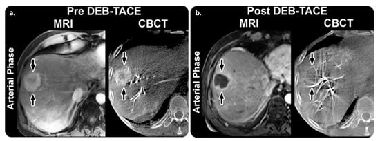 SmartCT software soft tissue technique and its role in management planning. (a) Arterial-phase images obtained before TACE. MRI revealing a 75 mm mass in the right lobe “arrow” with 65% enhancement. The mass has a similar enhancement (75%) with CBCT. (b) Arterial-phase images obtained after TACE. Mass shows almost no enhancement (5%) with MRI, and the tumor is decreased to 69 mm. With CBCT, the intraprocedural mass enhancement is decreased by 87%, which allows prediction of an objective EASL response at 1 month. Abbreviations: TACE, transarterial chemoembolization; MRI, magnetic resonance imaging; CBCT, cone-beam computed tomography; EASL, European Association for the Study of the Liver. Reprinted from “Intraprocedural C-arm dual-phase cone-beam CT: Can it be used to predict short-term response to TACE with drug-eluting beads in patients with hepatocellular carcinoma?” by Loffroy et al. [14] with written approval from the corresponding author and publisher (Radiology; Copyright 2013).