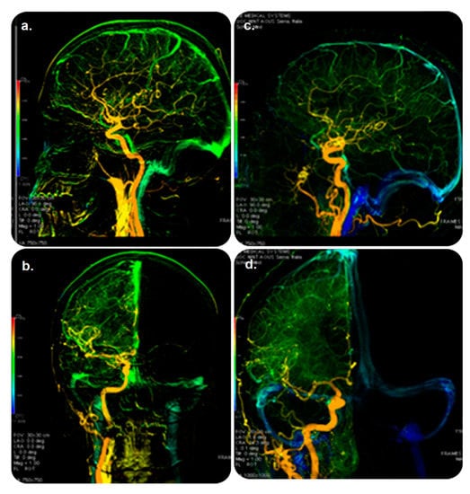 AngioViz software and its role in guiding therapy. DSA examination: (top) lateral and (bottom) anterior–posterior views of color-coded right carotid artery in controls (a,b) and patients (c,d) with multiple sclerosis. Blue color shown only in patients demonstrates prolonged cerebral circulation time. Veins are in green (and not in blue) in the controls (a,b). Abbreviations: DSA, digital subtraction angiography. Reprinted from “Cerebral circulation time is prolonged and not correlated with EDSS in multiple sclerosis patients: A study using digital subtracted angiography” by Monti et al. [20] with approval from the corresponding author and publisher (PLOS ONE; Copyright 2015 [open access license]).