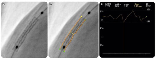 Quantitative analysis of StentBoost software images. (a) Enlarged and enhanced StentBoost image. (b) Manual tracing of longitudinal stent edges to avoid inadequate stent expansion. (c) Minimum stent diameter determined automatically. Reprinted from “Assessment of optimum stent deployment by stent boost imaging: Comparison with intravascular ultrasound” by Tanaka et al. [33] with written approval from the corresponding author and publisher (Heart and Vessels; Copyright 2013).