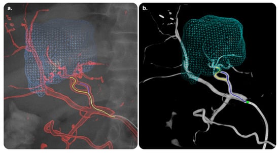 EmboGuide software and its role in the delivery of targeted therapy. (a) Feeding arteries superimposed on a live fluoroscopic image during selective catheterization. (b) 3D dynamic roadmap displayed on fluoroscopy after dual-phase CBCT enabling target volume segmentation, automatic feeding vessel detection, and selective microcatheterization of feeding vessels. Reprinted from “First human experience with directly image-able iodinated embolization microbeads” by Levy et al. [39] with written approval from the corresponding author and publisher (CardioVascular and Interventional Radiology; Copyright 2016).