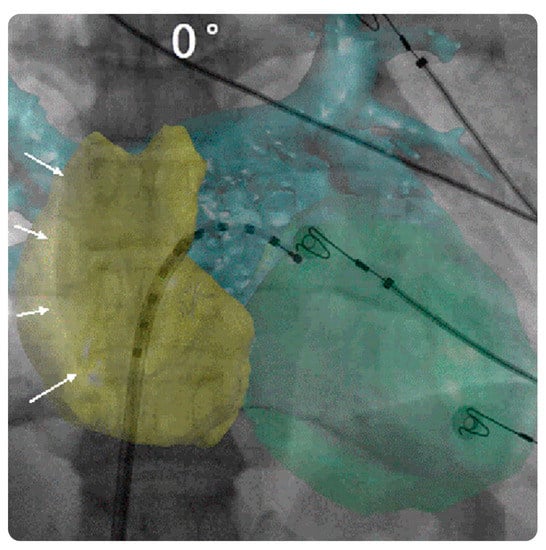 - Knecht, S.; Skali, H.; O’Neill, M.D.; Wright, M.; Matsuo, S.; Chaudhry, G.M.; Haffajee, C.I.; Nault, I.; Gijsbers, G.H.; Sacher, F.; et al. Computed tomography–fluoroscopy overlay evaluation during catheter ablation of left atrial arrhythmia. Europace 2008, 10, 931–938. [Google Scholar] [CrossRef] [PubMed]
