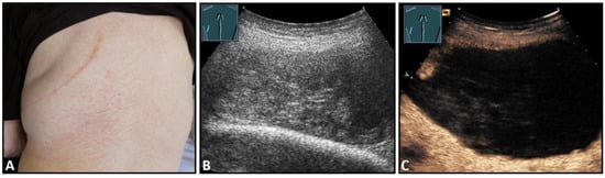 A patient after surgery for a bronchial carcinoma with a palpable chest wall tumor (A). B-mode US reveals a heterogeneous echogenic mass (B) without enhancement on CEUS (C), consistent with hematoma of the chest wall.