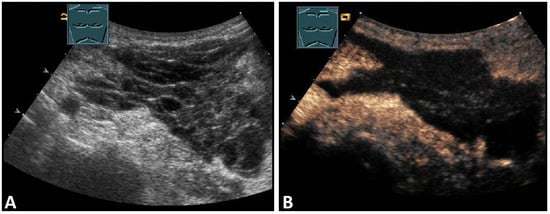 A patient after supraclavicular lymph node resection with postoperative presentation of a polyseptated mass in B-Mode US (A) with absent enhancement on CEUS (B), consistent with seroma in the upper thoracic aperture.