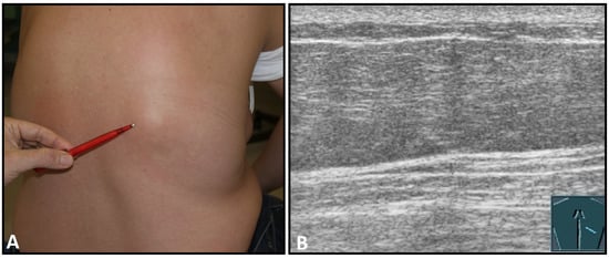 The most common tumors of the chest wall are lipomas, which manifest clinically as a painless and soft swelling, preferentially in adipose patients, usually between the ages of 50 and 70 years [15]. The sonomorphology is variable. In most cases (28–60%), lipomas present as a sharply localized, poorly vascularized, soft mass with an echo texture that is nearly indistinguishable from the surrounding adipose tissue. However, lipomas may also be more echoic (20–52%) or less echoic than the surrounding adipose tissue (20%) (Figure 5) [16,17].