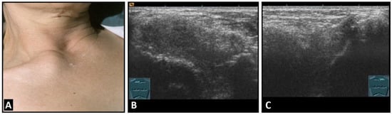 A patient with painful swelling of the right sternoclavicular joint (A). B-mode US shows a hypoechoic swelling similar to that in Tietze syndrome (B) in comparison with the contralateral left joint (C).