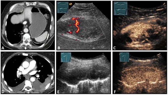 Top row: a neuroendocrine tumor on computed tomography (CT) (provided by Prof. Dr. Andreas H. Mahnken, Marburg, Germany) (A), CDS (B), and CEUS (C), here with inhomogeneous enhancement. Bottom row: a plasmocytoma infiltration on CT (D), B-Mode US (E), and CEUS (F), here with homogeneous marked enhancement.