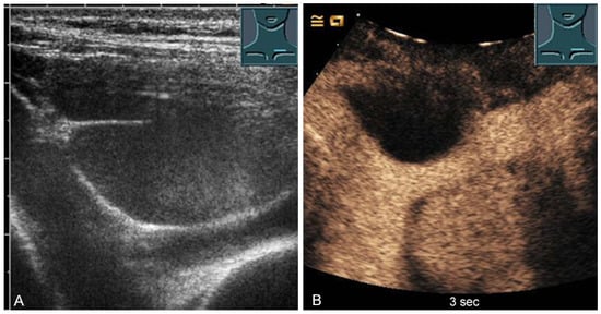 The CEUS examination is dependent on the clinical context and suspected findings. Before the contrast examination, the best position of the patient should be determined using B-mode US, and the target lesion should be identified. Linear probes with high frequencies are preferred in most cases, although curved arrays with lower frequencies may be useful in cases with deep lesions. The contrast agent is administered via avenous access as a bolus injection with a dose of usually 2.4 mL of SonoVue (Bracco, Milan). The lesion should be observed continuously and recorded by a clip for at least the first 30 s after contrast administration. Thereafter, the perfusion pattern of the lesions should be examined continuously by several short examinations at 30 s intervals up to 3 min.