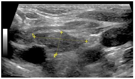 Reactive thymus enlargement (thymus rebound) can be observed after stressful situations (including surgery, burns, and chemotherapy) [31]. In childhood (2–8 years of age), thymic tissue is detectable in more than 90% of cases [33]. On US, the thymic tissue predominantly shows similar homogeneous echogenicity to that of the liver and spleen, with multiple hypoechoic strands. In individual cases, the thymic tissue shows an inhomogeneous echogenicity [34,35]. The hypoechoic strands appear as a “starry sky” on US and help to identify thymic tissue as such [34,35]. The characteristic US image is also helpful in identifying normal anatomic variants, such as cervical or retrocaval extensions of the thymus [34] (Figure 13).