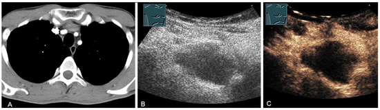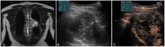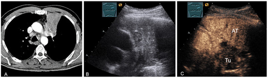- Pan, J.; Chen, W.; Zhang, H.; Huang, X.; Huang, X. Contrast-Enhanced Ultrasonography versus Contrast-Enhanced Magnetic Resonance Imaging in the Diagnosis of Mediastinal Tumors. Ultrasound Med. Biol. 2021, 47, 261–271. [Google Scholar] [CrossRef] [PubMed]