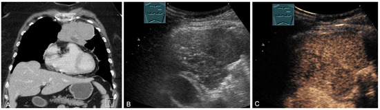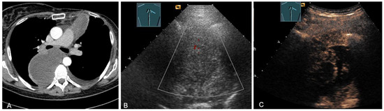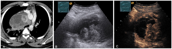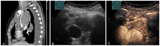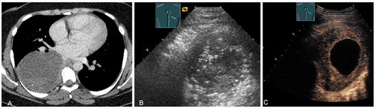 A cystic mediastinal mass on CT (provided by Prof. Dr. Andreas H. Mahnken, Marburg, Germany) (A), B-mode US (B), and CEUS (C), surgically confirmed as a mediastinally located bronchogenic cyst.