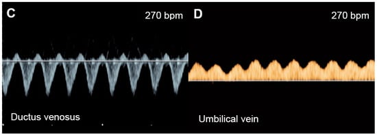 Of note, fetuses have high reserve potentials in responding to anemia. In spite of increased volume load, central venous pressure is not increased during the compensatory state, as indicated by increased forward flow in the ductus venosus during atrial contraction (markedly increased positive A-wave) (Figure 4) [19]. Several cases of fetuses with anemia show prolonged ICT [96], more pronounced than prolonged IRT as commonly seen in most cases developing FHF from other causes.