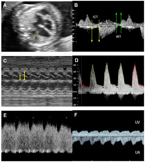 - Soveral, I.; Crispi, F.; Guirado, L.; García-Otero, L.; Torres, X.; Bennasar, M.; Sepúlveda-Martínez, Á.; Nogué, L.; Gratacós, E.; Martínez, J.M.; et al. Fetal cardiac filling and ejection time fractions by pulsed-wave Doppler: Reference ranges and potential clinical application. Ultrasound Obstet. Gynecol. 2021, 58, 83–91. [Google Scholar] [CrossRef]