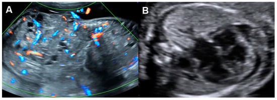 Several disorders are associated with an increase in combined cardiac output, such as arteriovenous malformations, the recipient of twin-to-twin transfusion syndrome and twin reversed arterial perfusion (TRAP) sequence (Figure 5), in which an acardiac twin without a heart or with a rudimentary heart is perfused by a pump twin [26]. Arteriovenous malformations most commonly occur in a highly vascularized mass, such as a placental chorioangioma, sacrococcygeal teratoma (Figure 6), hepatic hemangioma and aneurysm of vein of Galen. In these conditions, left to right shunting in the lesions causes systemic volume overload and is associated with increasing ventricular and atrial filling pressures.