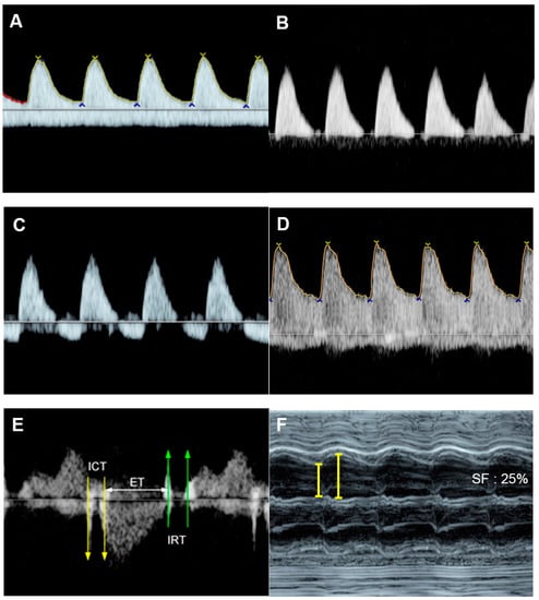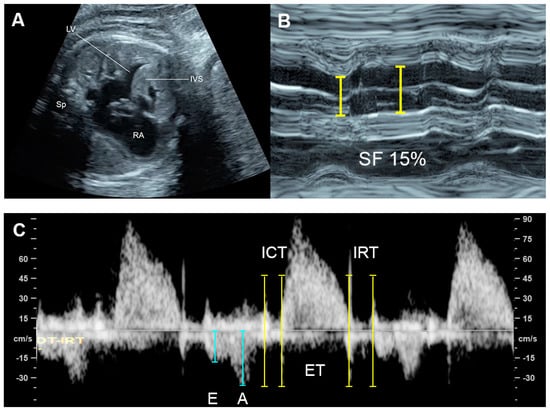 SF is one of the most commonly used M-mode parameters to quantify the global fetal systolic ventricular function using measurements of the percentage changes in ventricular dimensions at the ends of diastole (EDD) and systole (ESD), respectively [30]. The measurement is made on the standard four-chamber view, at the greatest dimension, typically at or just below the level of the atrioventricular (AV) valves. SF is calculated as follows: Left ventricle shortening fraction (LVSF) and right ventricle shortening fraction (RVSF) are calculated using this equation: SF = Dimension at end-diastole—Dimension at end-systole/Dimension at end-diastole and presented as percentage. Normal RVSF and LVSF are greater than 28% [31]. A lower SF indicates decreased systolic function, commonly seen in myocardial disease, an abnormally high afterload.