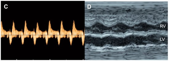 Color flow mapping and spectral Doppler study of the ventricular inflow and outflow are used to detect and quantify the degree of valve regurgitation, respectively. Holosystolic regurgitation of the tricuspid valve (TV), occurring during the entire duration of systole, is commonly associated with increased RV pressure, possibly related to outflow obstruction or arterial hypertension and also associated with structural cardiac defects, such as the Ebstein anomaly, TV dysplasia, etc. [38,39,40,41]. Trivial regurgitation of TV, non-holosystolic with a maximum velocity of less than 200 cm/s, is considered as normal variation [42,43]. Regurgitation of mitral valves (MV) should always be considered abnormal.