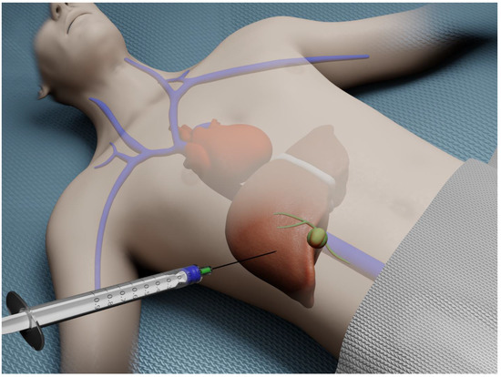 The first study of EUS-LB in humans was in 2006 [7]. The left lobe can be approached using ultrasound guidance from the proximal stomach, while the right lobe can be accessed from the duodenal bulb [8] (Figure 3).