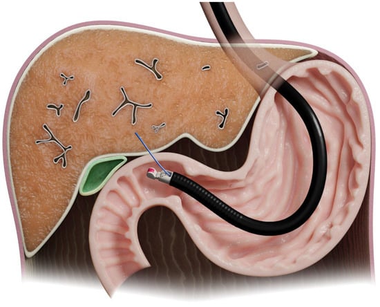 - Diehl, D.L. Endoscopic Ultrasound-guided Liver Biopsy. Gastrointest. Endosc. Clin. N. Am. 2019, 29, 173–186. [Google Scholar] [CrossRef]