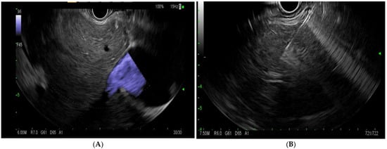 (A)—endoscopic ultrasound image of the liver with doppler. (B)—endoscopic-ultrasound-guided liver biopsy using a 19 G needle.