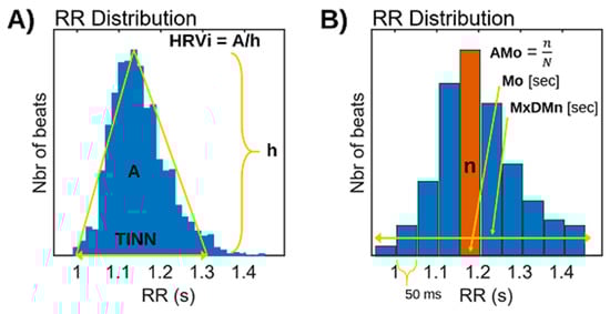 In addition to the above statistical measures, some geometric HRV analysis methods can be calculated based on the RR interval histogram. The HRV triangular index is the integral of the histogram (total number of RR intervals) divided by the height of the histogram, which depends on the selected bin width [55,56,57,58]. Another geometric measure is the TINN, which is the baseline width of the RR histogram evaluated through triangular interpolation (see Figure 2A).