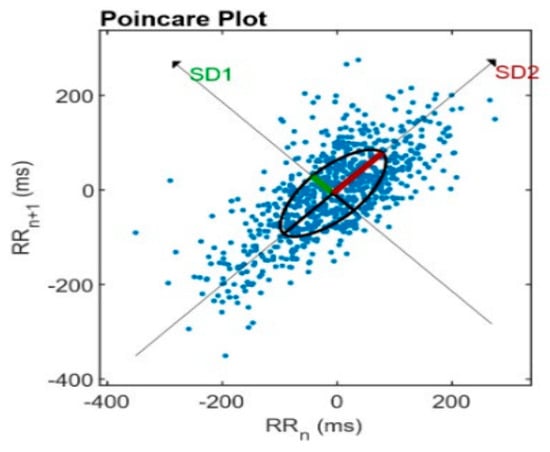 Poincare’s plot is a two-dimensional graphical representation of the correlation between consecutive RR intervals (RRn); each interval is plotted on the x-axis versus the next break (RRn+1) on the y-axis. It is a quantitative method obtained by adjusting an ellipse to the figure formed by the plot, from which the indices are SD1, SD2, SD1/SD2 [64,75] (see Figure 3).