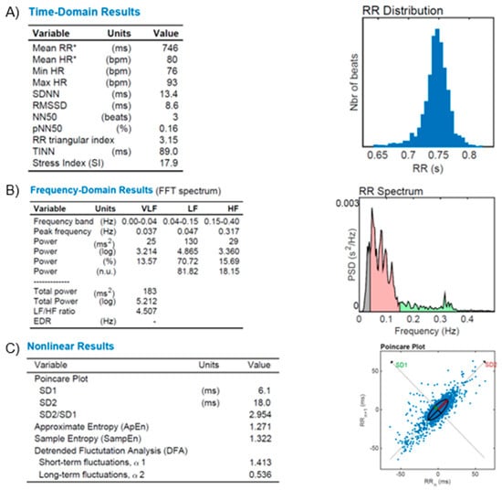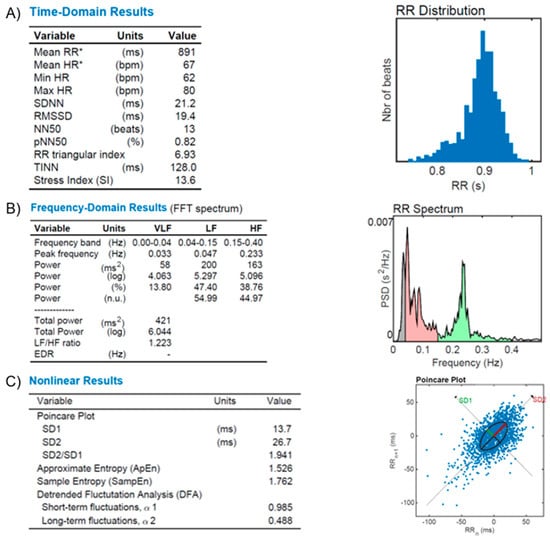 HR Variability (HRV) reports from a healthy subject. (A): Time-domain variables analysis (Mean RR, Mean HR, Min HR, Max HR, SDNN, RMSSD, NN50, pNN50, RR triangular index, and TINN, as described in the text); (B): frequency-domain variables analysis (FFT spectrum): Very Low (VLF), Low (LF) and High (HF) bands of frequencies; (C): Nonlinear results analysis with Poincare’s plot based on RR distribution and geometrical modeling for an ellipsis. Figures from our archive made with the software Kubios. *: Results are calculated from the non-detrended selected RR series.