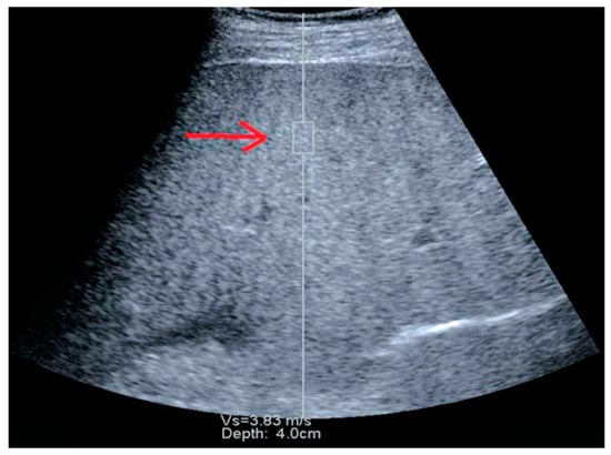 Point shear wave elastography (pSWE) using Siemens equipment. The “red arrow” is pointing to the region of interest (ROI).