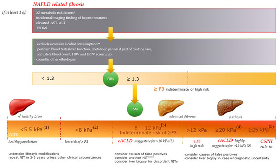 Screening algorithm for NAFLD-related Fibrosis. * the metabolic conditions include central obesity—waist circumference with ethnicity-specific cut-offs, serum triglycerides ≥150 mg/dL or specific treatment for hypertriglyceridemia, reduced serum high-density lipoprotein cholesterol <40 mg/dL in males (<50 mg/dL in females) or those undergoing a specific treatment, systolic blood pressure ≥130 mmHg, or diastolic blood pressure ≥85 mmHg or specific treatment, raised fasting plasma glucose between 100 mg/dL and 125 mg/dL (prediabetes) [128,129]; T2DM—type two diabetes mellitus; AST—aspartate aminotransferase; ALT—alanine aminotransferase; ** ≥30 g/day for men and ≥20 g/day for women; HBV—hepatitis B virus; HCV—hepatitis C virus; FIB4—Fibrosis-4 Index; LSM—liver stiffness measurement; T2DM—type two diabetes mellitus; VCTE—vibration-controlled transient elastography, whereby the values obtained with the XL probe are usually lower than those with the M probe [26]. (1) shear wave elastography (SWE) within the normal range can rule out significant liver fibrosis when in it is in agreement with the clinical and laboratory background [26], an LS ≤ 5 kPa presents high probability of being normal as recommended in the “rule of four” for acoustic radiation force impulse (ARFI) techniques [28], (2) VCTE < 8 kPa rules out advanced fibrosis in NAFLD [123], (3) the 8 kPa and 12 kPa dual cut-offs have a better diagnostic accuracy of NAFLD-related cACLD than the previously established cut-offs do [115] (cACLD is a term introduced in 2015 to describe the spectrum of advanced fibrosis (≥F3) and cirrhosis (F4) in compensated patients) (4) cut-off result from a recently published meta-analysis [130], and (5) according to the Baveno VII criteria [51], *** ELFTM < 9.8 or FibroMeterTM < 0.45 or FibroTest® < 0.48 to rule-out ≥F3 in NAFLD [123]. CSPH—clinical significant portal hypertension.