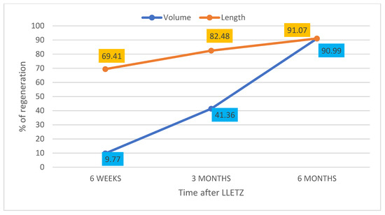 Regarding the percentage of volume and length recovered at 6 weeks, 3 months and 6 months, compared to pre-LLETZ cervical biometrics, the data are reported in Figure 5.