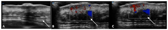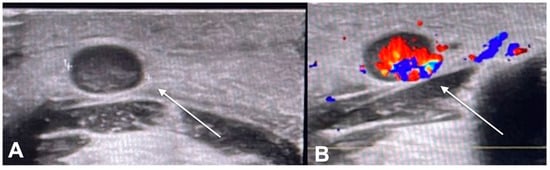 Early metastasis in the sentinel lymph node (SNL) demonstrates an elongated tumor due to immune cell aggregation [], with a low cross-sectional area, and remains undetectable by current diagnostic tools. Such lesions could be evaluated indirectly by doppler as the metastatic lesions have increased vascularity and show an enhanced vascular signal []. However, doppler ultrasound is not helpful in differentiation of benign lesions from malignant ones. Ultrasound, in the detection and staging of NMSCs, is more sensitive and specific than physical evaluation [,,,] and is considered superior in the detection of lymph nodes metastasis during NMSC surveillance compared to other diagnostic tools such as CT or PET/CT scan [,] (Figure 3).
