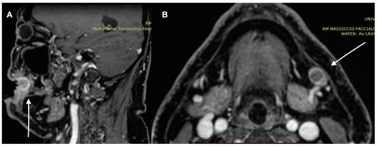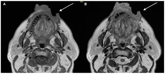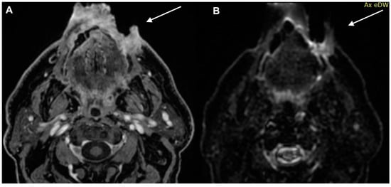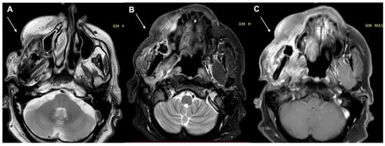 In NMSCs, diagnostic imaging is performed in high-risk patients with suspicion of bony or other soft invasions, such as suspicious perineural invasion, therefore, an MRI (Figure 4, Figure 5 and Figure 6) scan is performed to assess the lesion extension and depth in soft tissue; and positron emission tomography (PET)/CT, 18F-fluorodeoxyglucose (FDG) is helpful in assessing nodal and distant metastases [,]. CT examination is preferred only to evaluate bone invasion due to its poor soft tissue contrast, which makes it difficult to evaluate NMSCs lesions and demonstrate non-specific tissue density [].