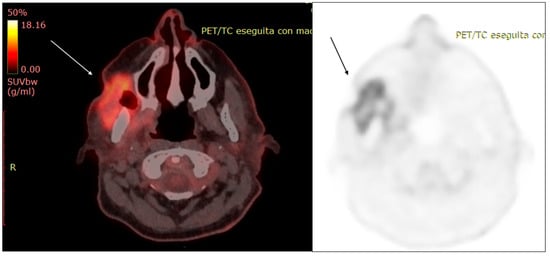 PET/CT scan is advised clinically in patients with NMSC to diagnose distant metastasis, has high sensitivity in assessing the primary and recurrent squamous cell carcinomas with nodal disease, and plays a critical role in lesion management in about 22–28% of cases [,]. BCCs have low metastasis potential, so PET/CT is not recommended for BCCs. The maximum standardized uptake value (SUV) of recurrence SCC (6.4) is less than primary SCC without recurrence (13.0) [], whereas SUV for MCCs ranges from about 4 to 6.5 []. A systematic review by Schröer-Günther et al. [] including 1155 patients reported PET and PET/CT sensitivity and specificity ranging from 68 to 87% and 92 to 98%, respectively, in patients with stage III and IV malignant melanoma. However, such systematic review data are lacking for nonmelanoma skin cancer in high-risk patients to demonstrate PET and PET/CT diagnostic accuracy, sensitivity, and specificity. However, the sensitivity of FDG-PET is based on the size of the tumoral lesion, its anatomical location, and rate of FDG standardized uptake value. In short, PET/CT is superior to MRI and CT in evaluation of nodal metastasis, regional nodes, and distant metastasis but is limited in low-risk carcinomas and early stages of carcinomas (Figure 8).