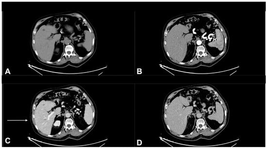 A 78-year-old male patient in treatment with immunotherapy, enhanced CT imaging (128 slices) performed in July 2021. Pre contrast phase CT (A), Arterial phase (B), Portal phase (C), Tardive phase (D). In the portal phase (C), vague hypodense areas not visible in the other phases of the study, fifth hepatic segment. These areas were suspected of liver metastases from squamous cell carcinoma.