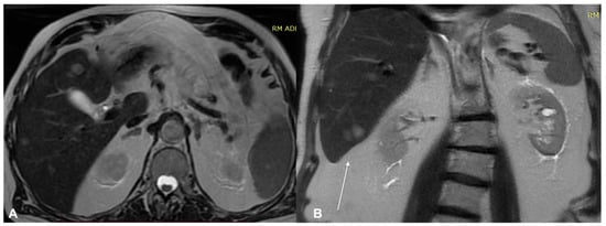 MRI examination of the previous patient performed in August 2021—T2 weighted imaging. Axial section (A), Coronal section (B). Hypointense areas in the fifth hepatic segment.