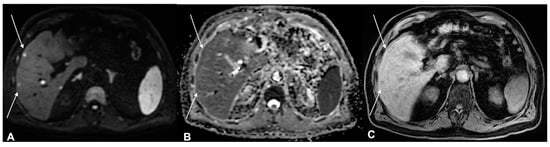 MRI examination of the previous patient performed in August 2021. DWI (A), ADC (B), enhanced MRI imaging (C). The lesions show high signal in DWI, low signal in ADC, and intensity reinforcement in the contrast-enhanced study image. Suspicious areas are confirmed as metastatic lesions.