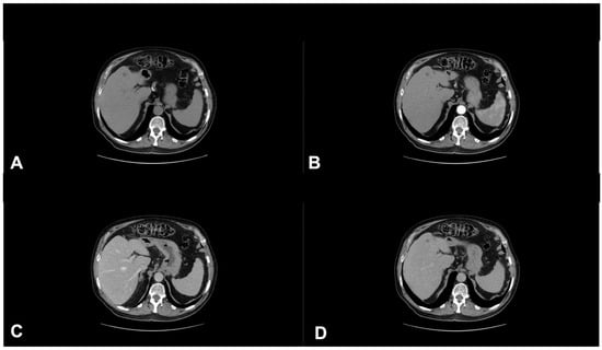 Enhanced CT imaging (128 slices) of the previous patient performed in March 2022. Non enhanced CT (A), Arterial phase (B), Portal phase (C), Tardive phase (D). The metastatic lesions were no longer present, pseudo progression.