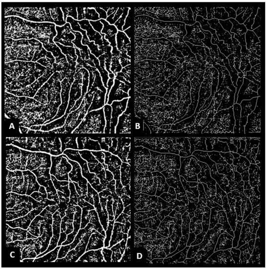 The RVTI measurements were performed using ImageJ program version 1.52 u 64-bit Java 1.80_112 (Wayne Rasband, National Institutes of Health, Bethesda, MD, USA, https://imagej.nih.gov/ij accessed on 4 April 2020). In brief, 6 × 6 mm en-face OCTA images were converted into 8-bit grayscale images. Then, the Otsu method was used to binarize the OCTA image. A skeleton model of the superficial retinal vascular plexus was created (Figure 1). RVTI was calculated as the ratio of each vessel length to its Euclidean distance on the skeleton model using the Analyze Skeleton plug-in [27].