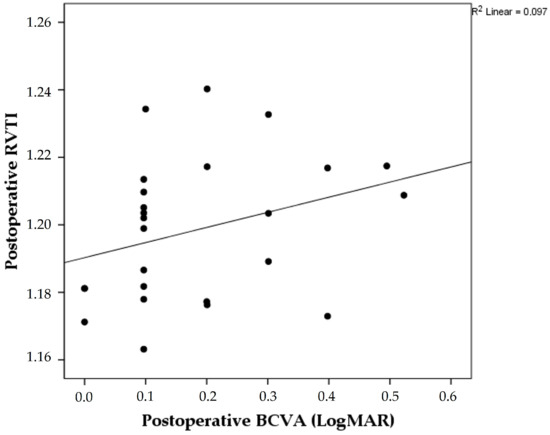 Considering the relationship of evaluated parameters with postoperative BCVA scores, the only statistically significant correlation was found between postoperative RVTI and postoperative BCVA (rho = 0.408, p = 0.043) (Figure 3).