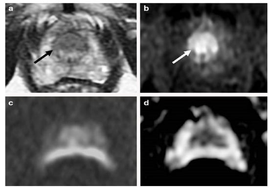 An example of mp-MRI diagnostic performance in a 62-year-old man with PSA 6.04 ng/mL. The DWI (a) and ADC maps (arrows) (b) showed a mild restricted diffusion in the bilateral base PZ. Unclear signal intensity on the T2WI (c) and a diffuse wedge-shaped enhancement on the DCE-MRI (d), imagined showing an inflammatory change. A systematic TRUS biopsy was performed with negative cores. “Reprinted with permission from Ref. []. 2020, Springer”. More details on “Copyright and Licensing” are available via the following link: https://link.springer.com/article/10.1007/s00330-020-06782-0 (accessed on 12 March 2020).