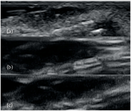 The same BCC examined with 13 MHz (a), 20 MHz (b) and 40 MHz (c). As the frequency increases, the presence of the two hyperechoyc spots is clearer.