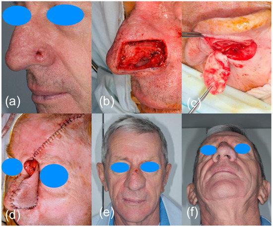 Surgical excision of a nasal BCC: (a) clinical presentation of the malignant lesion; (b) surgical defect after tumor resection together with alar cartilage and a portion of nasal mucosa; (c) auricular cartilage graft for prefabricated frontal flap; (d) reconstruction of the nose with prefabricated frontal flap and auricular cartilage; (e,f) clinical aspect 1 month after surgery.