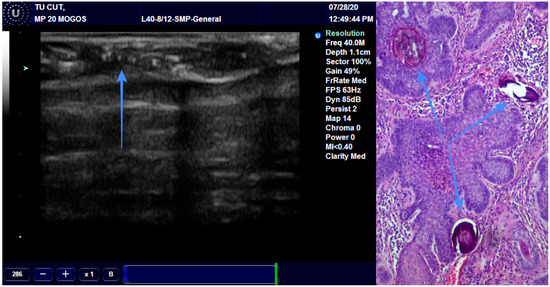 The arrow is showing the presence of the hyperechoic spots in a BCC and the pathological correspondence.