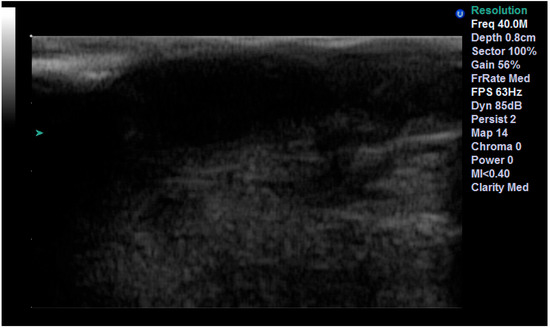 We assessed the concordance between the final diagnosis and ultrasound diagnosis, and we found a Cohen’s Kappa of 0.8897 (95% CI: 0.6783–1.1011), bias-adjusted Kappa of 0.8895 and prevalence- and bias-adjusted Kappa of 0.9355 (Table 3). The concordance between the final diagnosis of BCC and the presence of hyperechoic spots followed an identical pattern. We have associated the presence of the hyperechoic spots with diagnosis of BCC (Figure 4). Only one case of BCC was misdiagnosed by echography due to the missing hyperechoic spots (Figure 5).